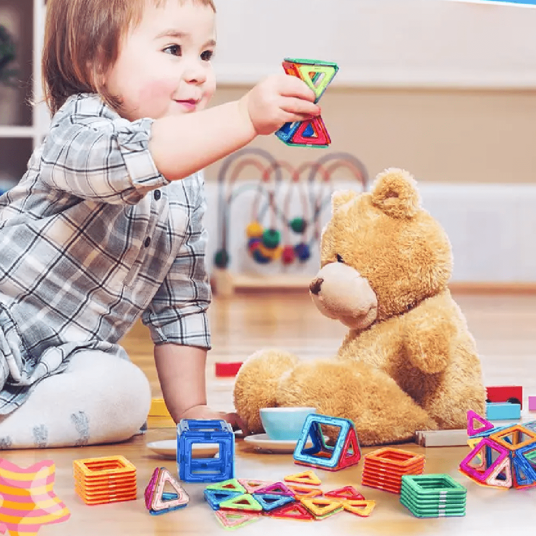 Admire la concentración y la atención de su hijo mientras juega con sus Bloques magnéticos MONTESSORI®