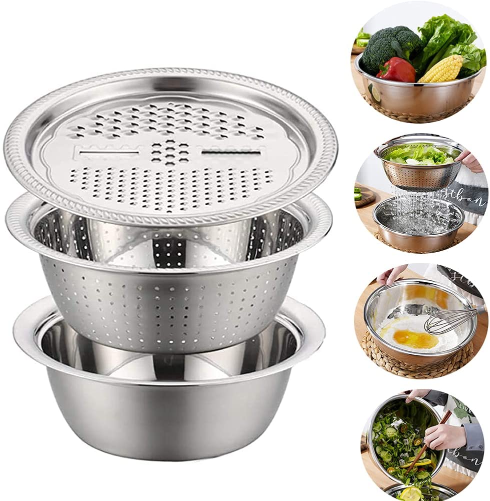 El juego de tazones y el tamiz están hechos de acero inoxidable de alta calidad, 3 en 1 Molinillo, copos de acero inoxidable, adecuado para patatas, el material grueso se profundiza en gran capacidad, hecho de acero inoxidable grueso,. Fuerte y duradero, gran capacidad de 11cm de profundidad, pepinos, zanahorias y otras verduras y frutas.